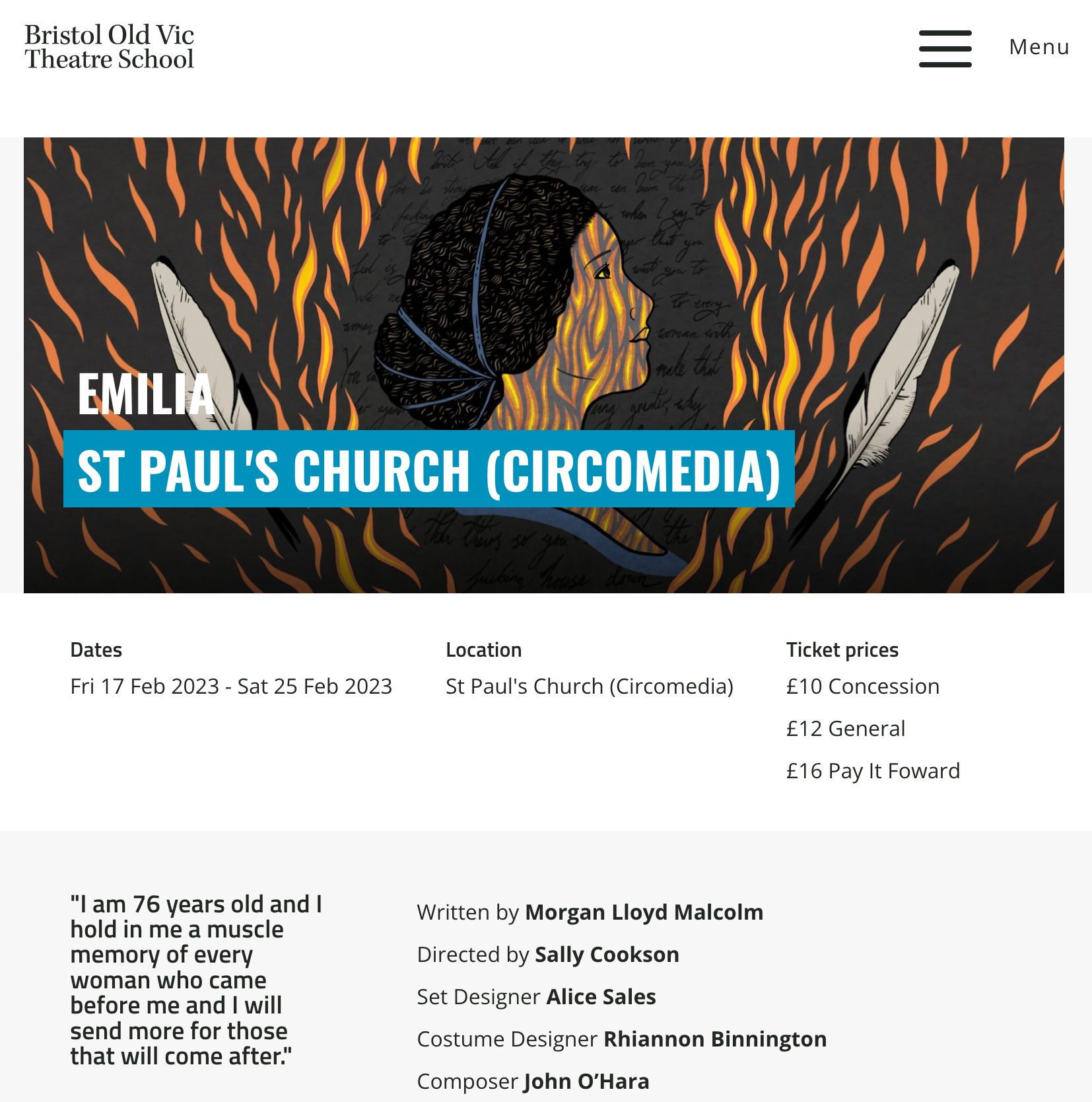 Show image used for print and online marketing for Bristol Theatre Schools production of Emilia.
