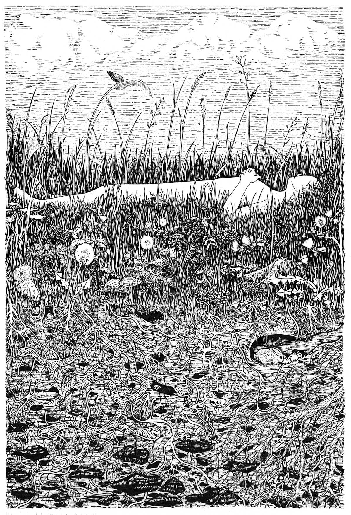 In this hand-drawn illustration, I capture the vibrant yet hidden life in an ecosystem. The viewer makes the journey from the airy openness of the sky, down through the tall, swaying grass and into the soil's mysterious depths. The skies are etched with billowing clouds, a testament to the ever-changing nature of life. Just below, the dense grass is lush and abundant, linear forms create a texture that contrasts with the sky’s softness. A tiny bird balances on a reed, curious of the human lying almost lifeless in the grass, as the busy ecosystem hums with life all around them.
