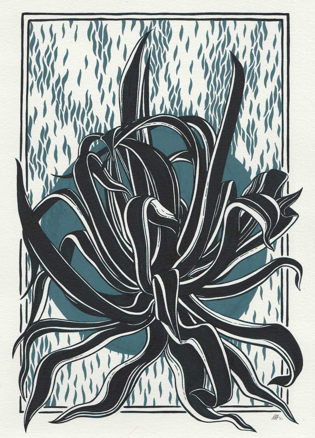 Giant Agave study from Barcelona botanical gardens. Agave plants like to be drenched with water and then left for the roots to completely dry out. This way the moisture stored in their leaves can be used, and then replenished when the rains come back. Gouache painting on A4 watercolour paper, 300 gsm.